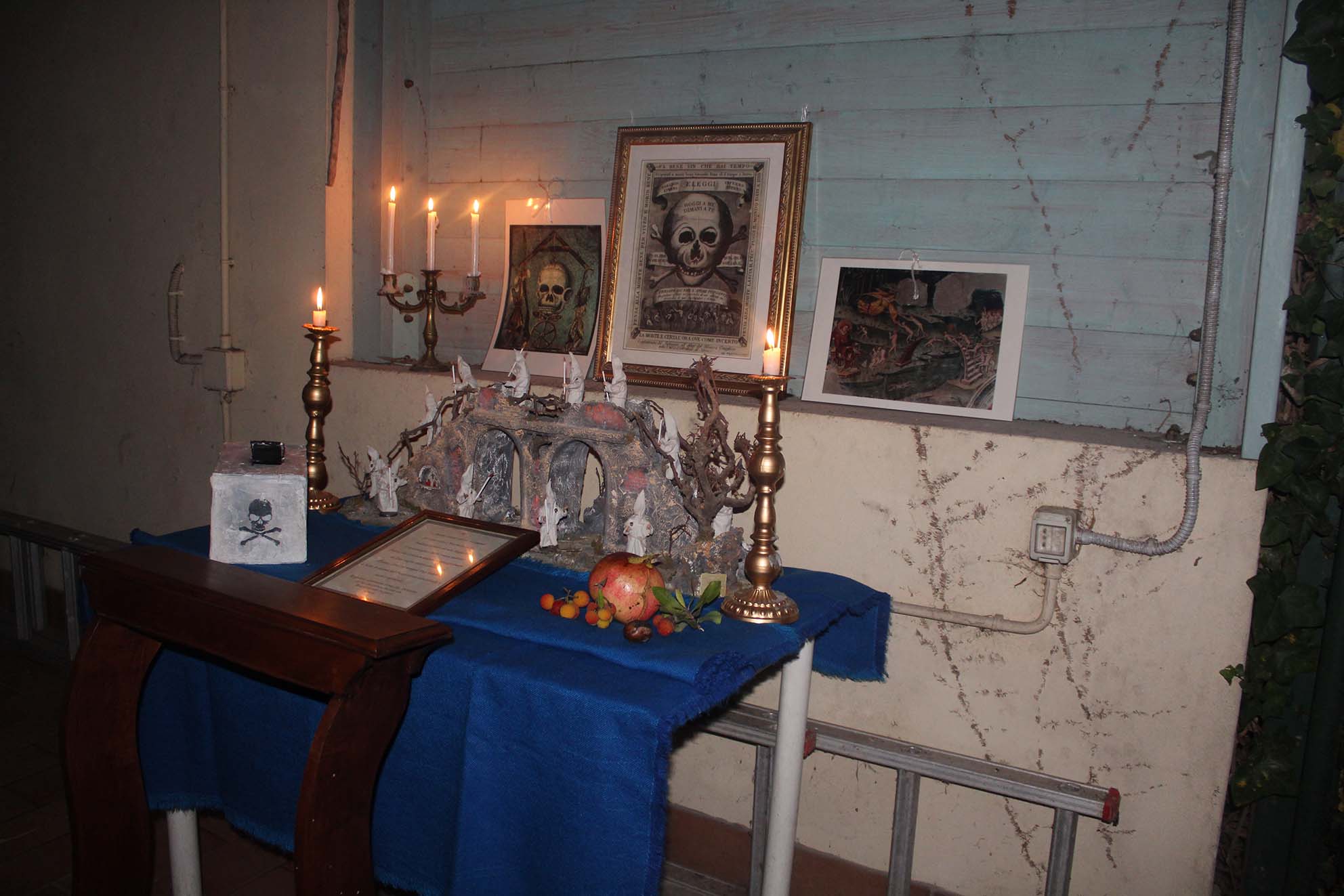 Infine l’illustrazione di una tavola imbandita e, all’esterno l’illustrazione dei simboli, come il sacchetto di grano, la scopa rovesciata, la bacinella, il bastone, e, ogni volta, la scoperta delle ragioni di quelle presenze che affondano le radici nella tradizione abruzzese. Durante la serata è stato possibile rendere omaggio alla Chiesa della Santissima Trinità, situata nel borgo, regolarmente aperta: l’ingresso è stato caratterizzato dalla presenza di un ‘Pulcinella abruzzese’, quale trait d’union tra il mondo dei vivi e quello dei morti, e, secondo le antiche credenze, il primo che è entrato ha liberato un’anima del Purgatorio.