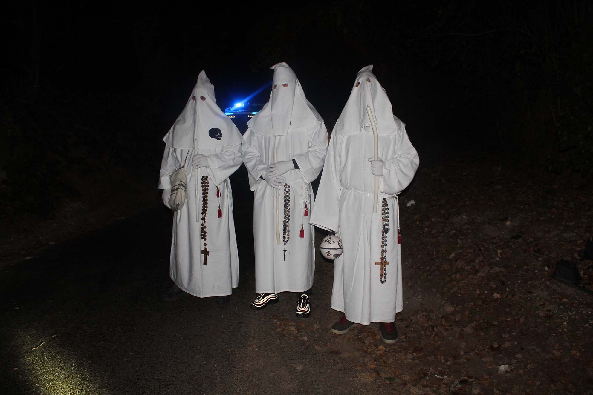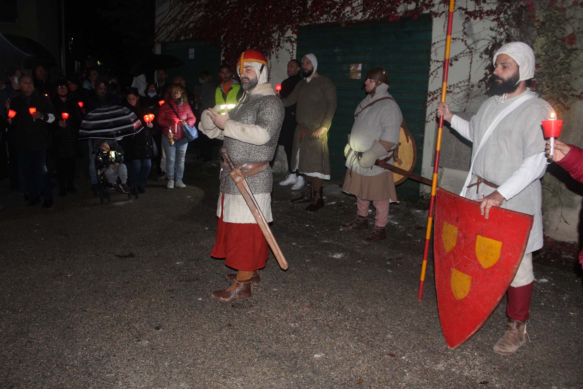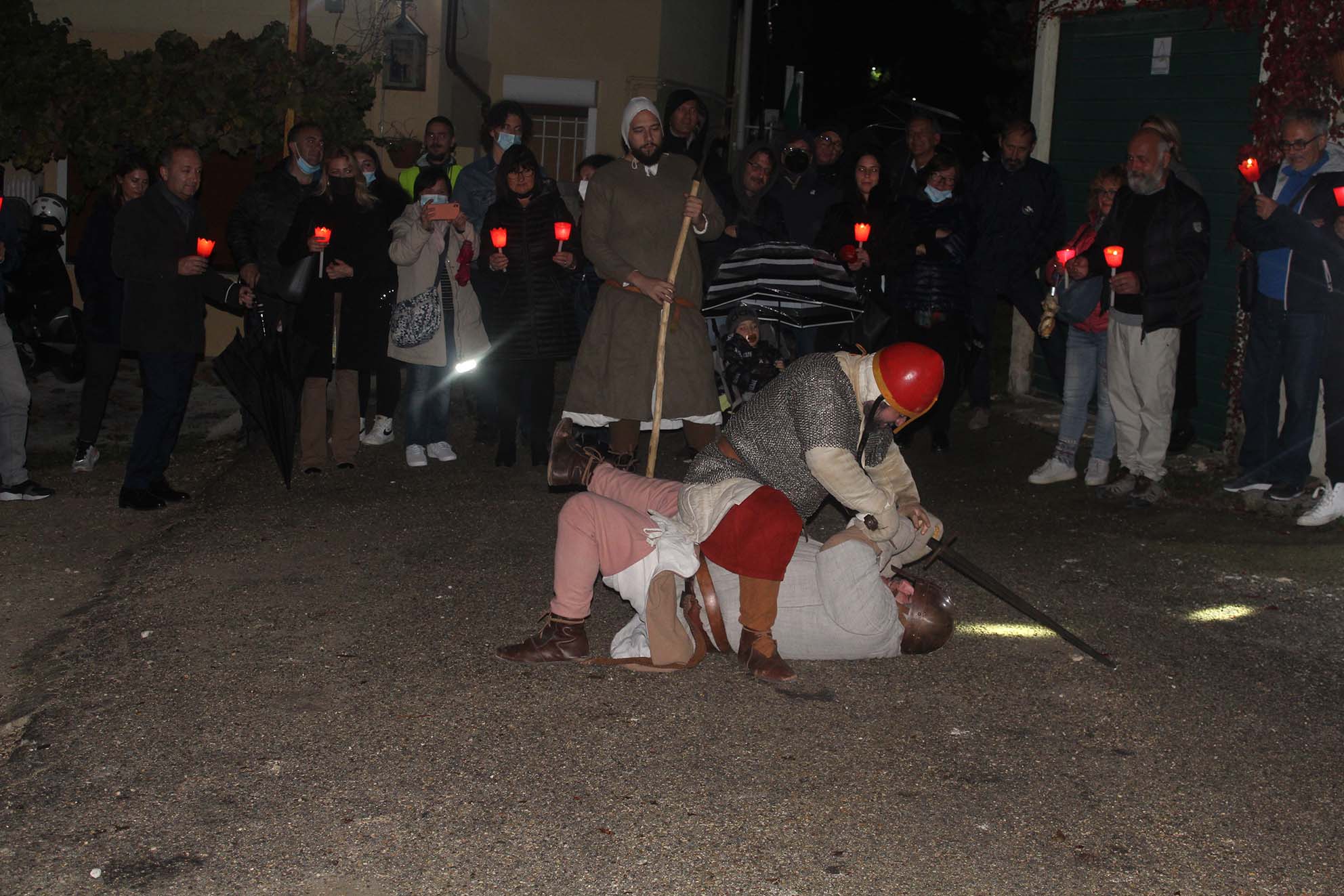 L’evento, completamente gratuito, ha preso il via alle 19, dinanzi alla sede della Motorizzazione civile, con il ‘Racconto dei Luoghi’, e, con la sola luce delle candele, è partito il cammino verso il Borgo Case Troiano, con alcune pause, ciascuna delle quali è stata caratterizzata da un racconto su vicende e personaggi che hanno caratterizzato il Borgo stesso. Lungo la stradina del borgo, alla ‘vutate de lo lope’, si è incrociata la Processione dei Frati Morti accompagnati dai Cavalieri erranti di Marco De Marinis e la Compagnia di Rievocazione medievale, con la storia dei ‘tre vivi e tre morti’, che ha accompagnato i presenti sino all’oliveto dove ad aspettare il pubblico c’era ‘Lu’ Mazzamurille’, spiritello dispettoso abituato a prendersi gioco dei vivi, e la ‘tomba del Cavaliere’. All’ingresso del Borgo Case Troiano è stato allestito l’Altare devozionale per le anime del purgatorio, con la rappresentazione della Processione dei Frati ricostruita dal Maestro presepista di Napoli Aldo Vucai, e quindi la tappa nell’aia con il combattimento mortale tra i Cavalieri erranti.