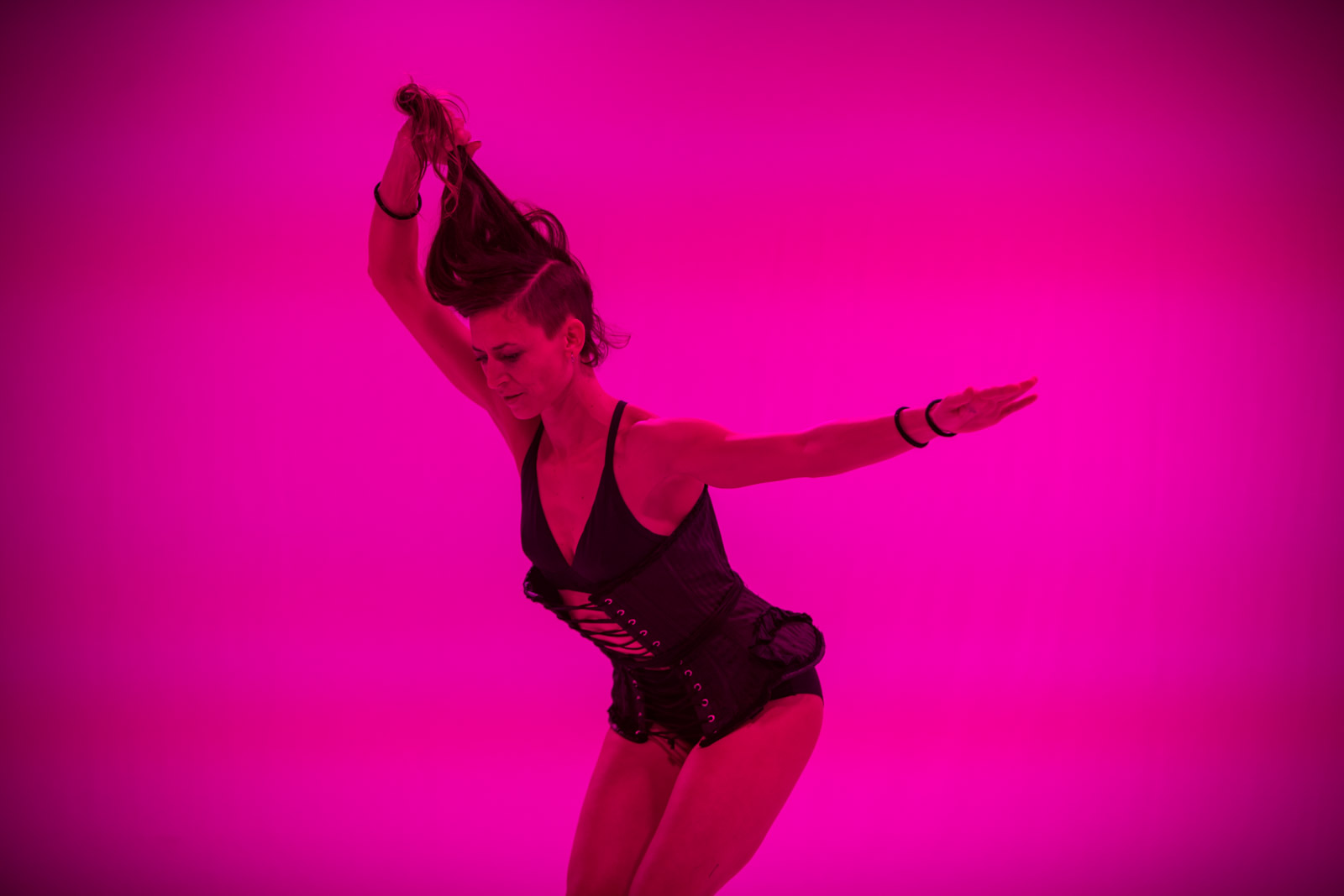 Due corpi femminili in assenza di equilibrio: la postura è instabile, la voce innaturale, il respiro limitato, costretto dai lacci di un corsetto. Due donne in bilico tra il tentativo di raggiungere un modello estetico e il riconoscere che questo stesso modello è un’imposizione culturale e sociale.