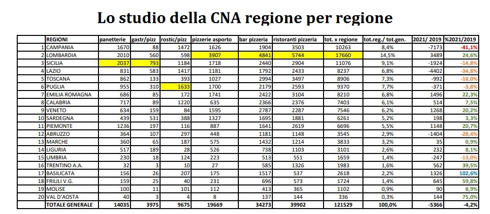 L’indagine – e siamo così ai numeri – rivela che tra il 2019 e il 2021 le attività inerenti alla pizza sono calate del 4,2%, vale a dire di 5.366 unità, scendendo nel complesso a quota 121.529. La regione che ha subito il più brusco arretramento è stata la Campania, che ha perso il 41,1% delle attività. La netta flessione ha coinvolto soprattutto le regioni centro-meridionali, perché dopo la terra che la pizza ha inventato, a pagar dazio alla crisi sono state nell’ordine il Lazio (-34,8%), proprio l’Abruzzo (-28,4%, con 3.545 attività rimaste in campo e una diminuzione in termini assoluti di 1.404 esercizi), la Sicilia (-14,8%) e l’Umbria (-13%). Mentre, all’opposto, a sbalordire è la crescita in termini assoluti nelle più grandi regioni settentrionali, con la Lombardia che incrementa complessivamente il numero delle attività legate al mondo della pizza di 3.489 unità (+24,6%), toccando quota 17.660 attività e scalzando così proprio la Campania dal gradino più alto del podio. Mentre performance di tutto rispetto hanno riguardato Emilia Romagna (+ 1.496 attività), Veneto (+ 1.268) e Piemonte (+ 1.148).